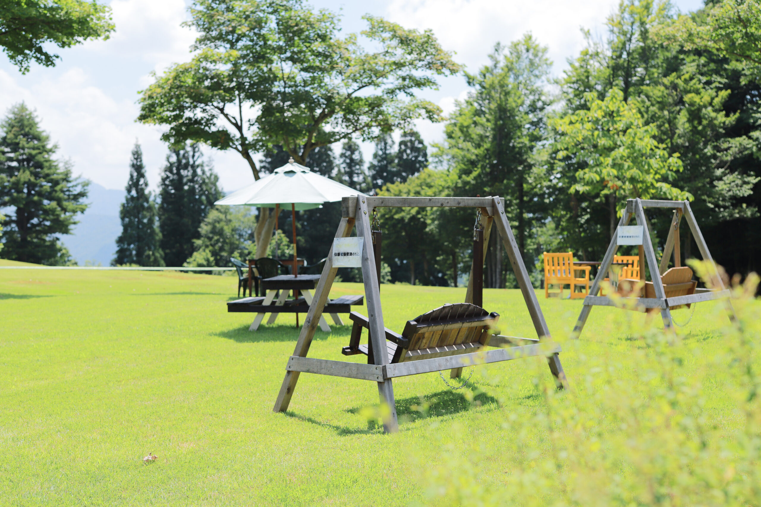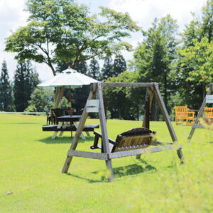 総合案内所横の芝生広場には、木製ブランコやイス・テーブルがあり、のんびりお過ごしいただけます。